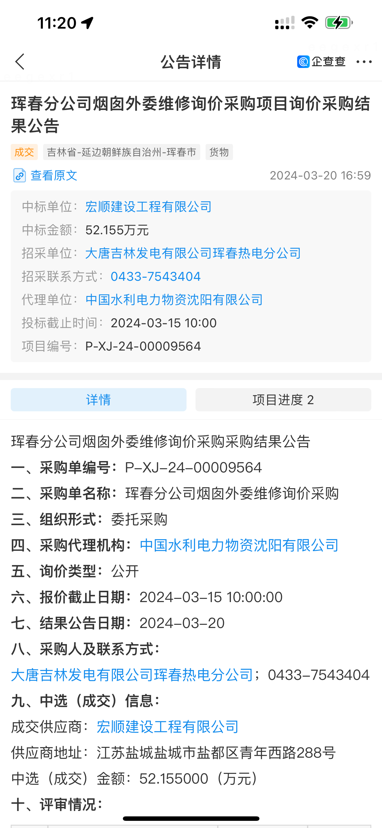 热烈祝贺我公司中标大唐吉林发电有限公司珲春热电的烟囱外委维修工程